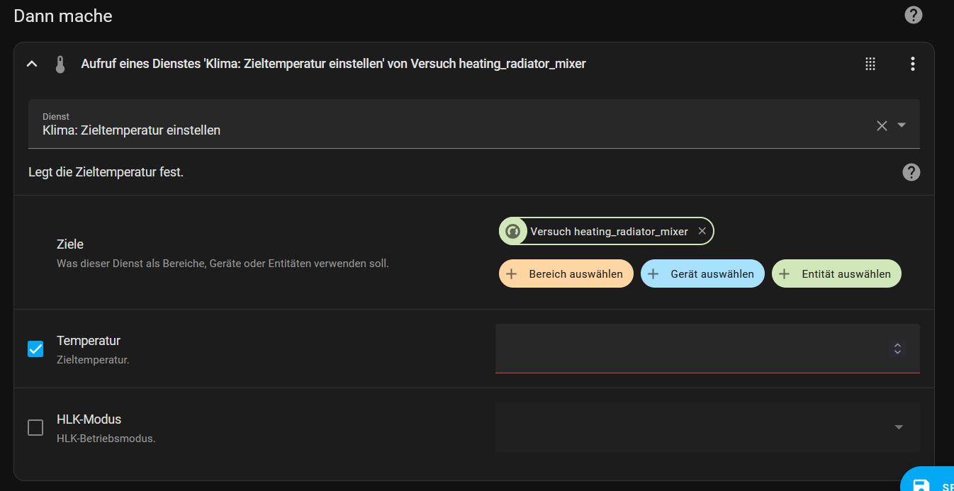 ich habe auf einem ESP eine climate: Integration die ein drei Wegemischer steuert. In Home Assistent habe ich über die Außentemperatur eine Heizkurve berechnet. Hat jemand eine Idee, wie ich die Solltemperatur der climate: Integration auf den berechneten Wert der Heizkurve stellen kann? Also theoretisch habe ich gedacht man könnte eine einfache Automation dafür verwenden. Der Trigger ist die Veränderung der Heizkurve, eine Bedingung ist nicht nötig und die Aktion ist Aktualisiere den Sollwert mit dem Helfer Heizkurve. Leider scheint es doch nicht so einfach zu sein ![]()