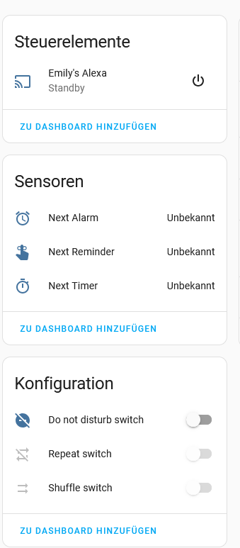 Ich wollte den Alexa Media Player einbinden und habe die Anleitungen auf YOutube benutzt. Das hat soweit auch funktioniert und alle Geräte sind da. Jedoch kann ich kein einiges steuern.