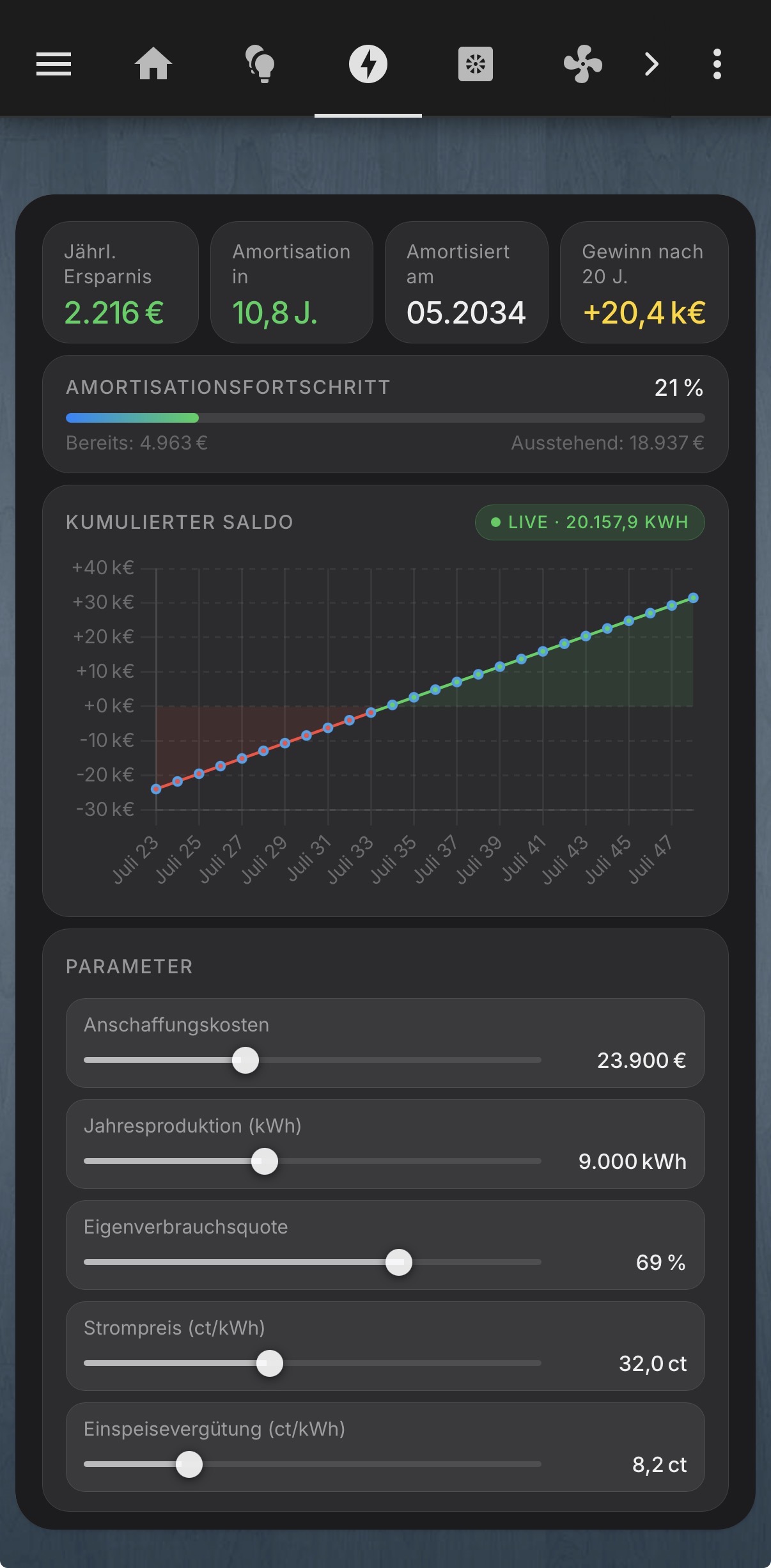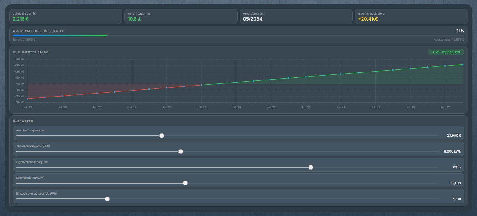 Ich wollte mal meine neueste ‚Errungenschaft‘ mithilfe von claude.ai zeigen. Ein kleines Tool zur Berechnung der Amortisation einer PV-Anlage. Wird sowohl am Desktop als auch mobil korrekt angezeigt![]()