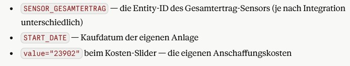 Als nächstes muss im FileEditor unter Config/www eine Datei erstellt werden mit dem Namen pv_amortisation.html, worin nachfolgender Code (https://pastebin.com/VC8fdmyh) eingefügt wird. Im Konfigurationsteil (Zeile 292) muss ein HA-Long-Lived-Token eingefügt werden. Speichern, HA neu starten.