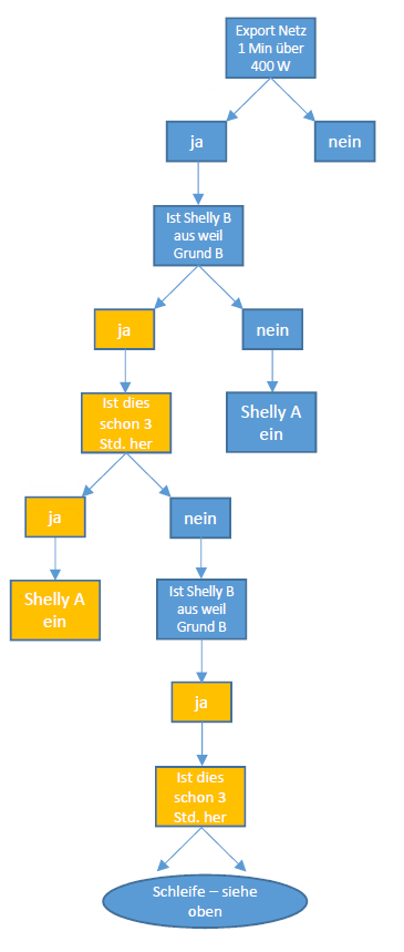 A:) Shelly A soll einschalten wenn PV-Überschuss für 1 Minute über 400 W liegt. Jedoch nur wenn Shelly B ausgeschaltet ist.