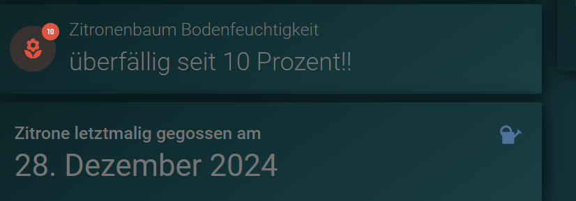 Nun fehlt mir aber eben noch die zusätzliche Meldung bei Unterschreiten einer bestimmten Bodenfeuchte. Bzw. kann ja auch statt Tage (fällig in…) meine Bodenfeuchtigkeit angezeigt werden. Also fällig in 17 % z.B.