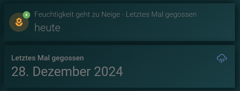 Ich möchte auf meinem Dashboard eine Karte, die ein Datum anzeigt, dass erzeugt wird, wenn ich in dieser Karte auf einen Knopf drücke. Sinn soll sein, dass ich weiß, wann zuletzt die Blume gegossen wurde. Zudem ein Feld in dieser Karte, in dem ein Hinweis angezeigt wird, dass heute gegossen werden soll, wenn ein Sensor ein bestimmter Wert hat (Bodenfeuchte).