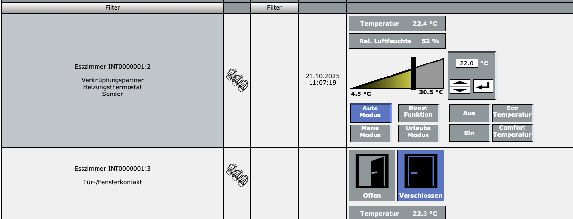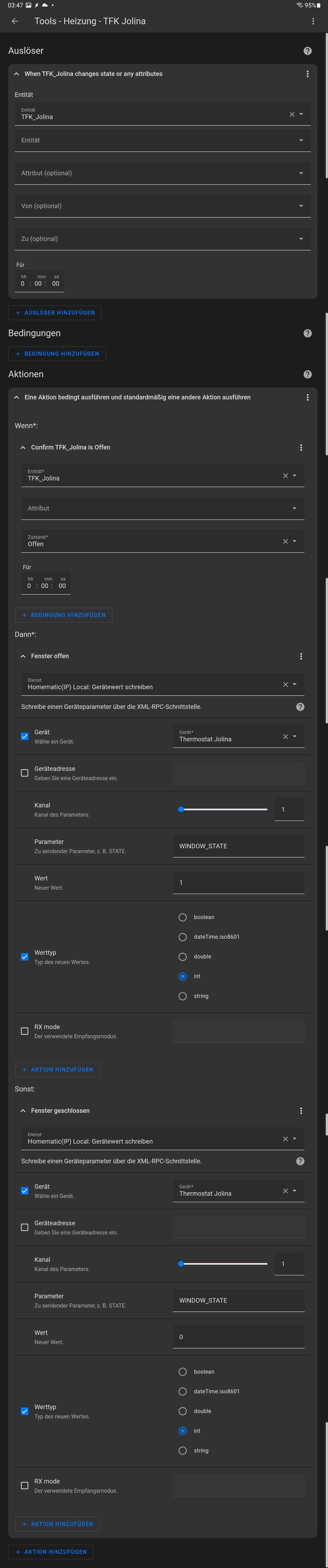 Da es draußen kühler geworden ist, habe ich mir nun die Frage bezüglich „Fenster auf - Heizung aus“. Beim Iobroker konnte ich den State einfach an homematic übergeben mit einen Aqara Türkontakt Sensor. Hat jemand eine Idee oder Lösung dieses mit Homeassistant auch umzusetzen? In meiner Rasbimatic Oberfläche sollte dann auch Fenster offen stehen.