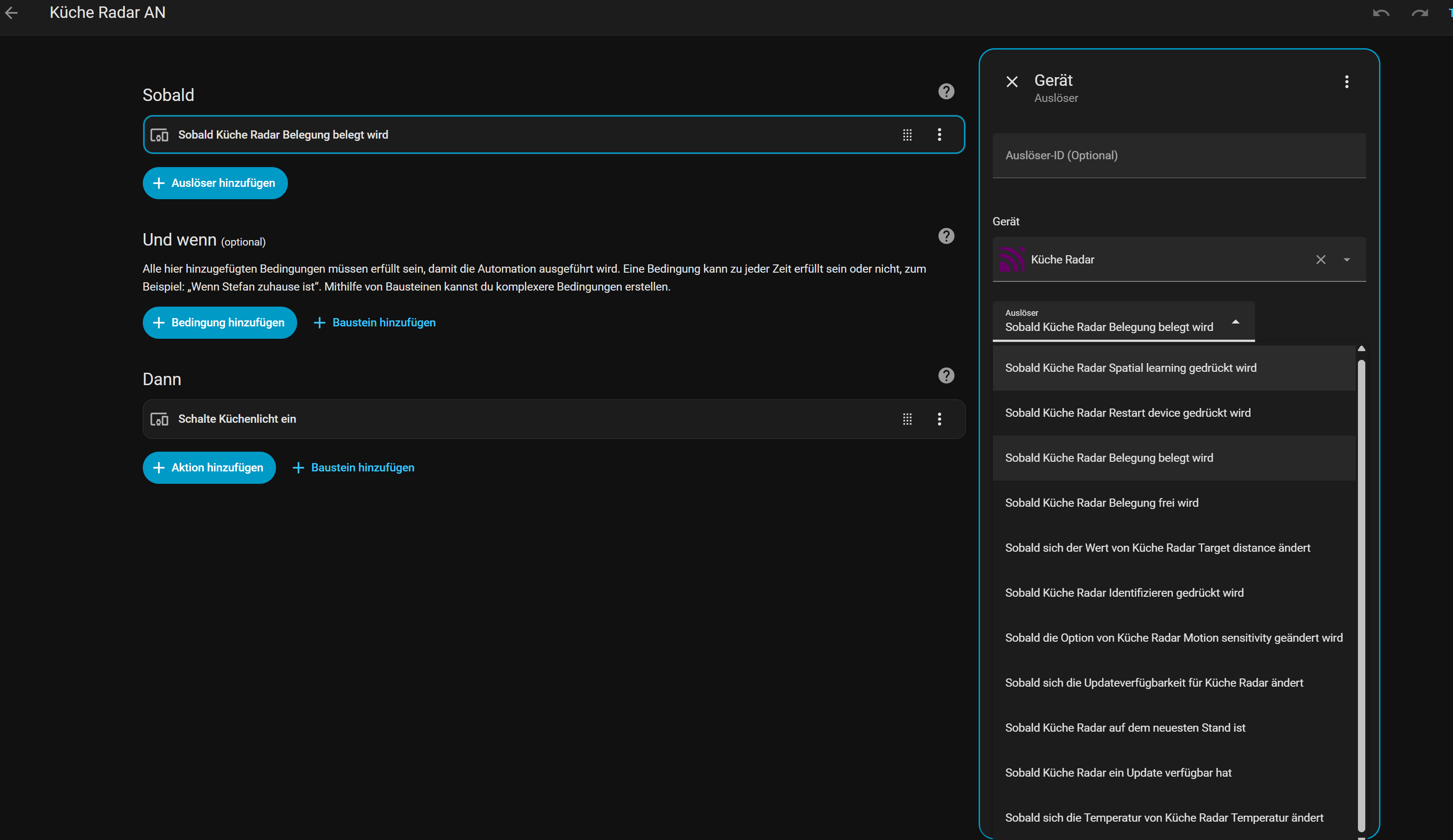 Bei mir ist das auf deutsch alles ich würde den sensor ja gerne so nutzen dass er auch erkennt wenn ich in dem raum verbleibe also nicht nur bewegung erkennt. ich weis nciht wie ich da 2 automationen in einer machen soll. ich habe diese auswahlmöglichkeiten welche soll ich da nutzen?