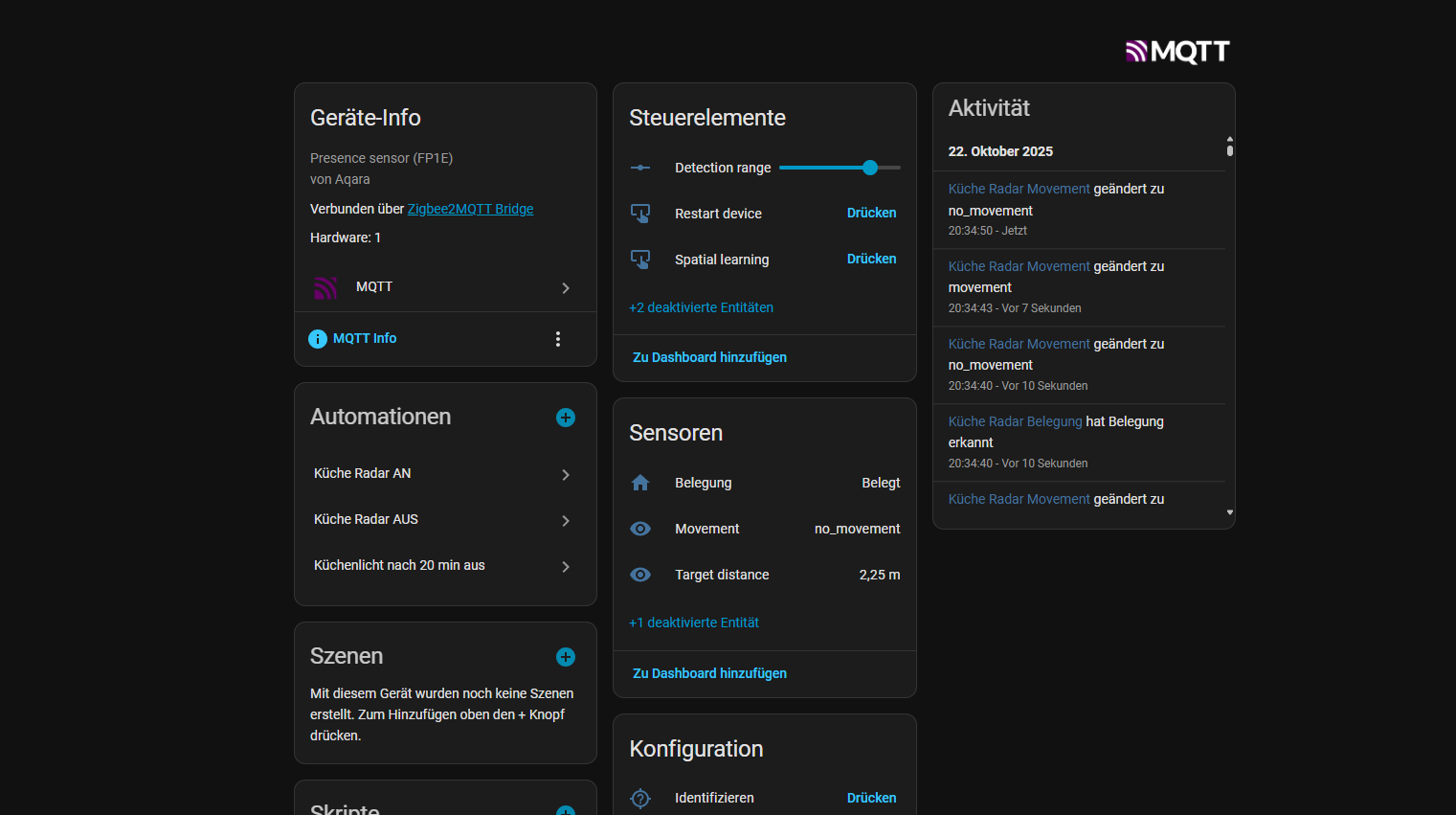ich nutze den Aqara FP1E Präsenzsensor in meiner Küche, der über Zigbee2MQTT in Home Assistant eingebunden ist. Mein Problem ist, dass das Küchenlicht ständig ausgeht, obwohl ich mich im Raum befinde und der Sensor meine Anwesenheit eigentlich erkennt. Der beigefügte Screenshot zeigt, dass der Sensor kurz nach einer Erkennung wieder auf die Zustände Movement: no_presence und Belegung: Frei wechselt. Ich verstehe nicht, warum die Automation das Licht so schnell ausschaltet, wenn doch eine Bewegung da war