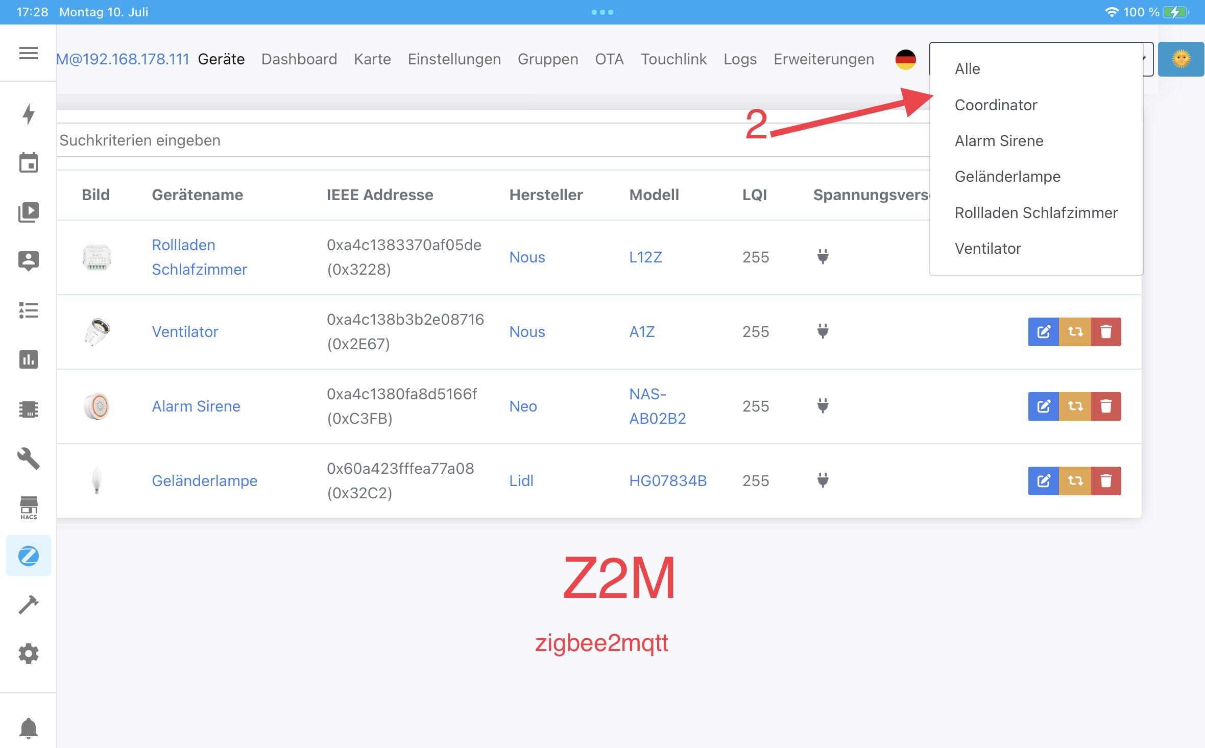 Zigbee2MQTT ungefähr das gleiche (Pfeil 2) drücken und auswählen
