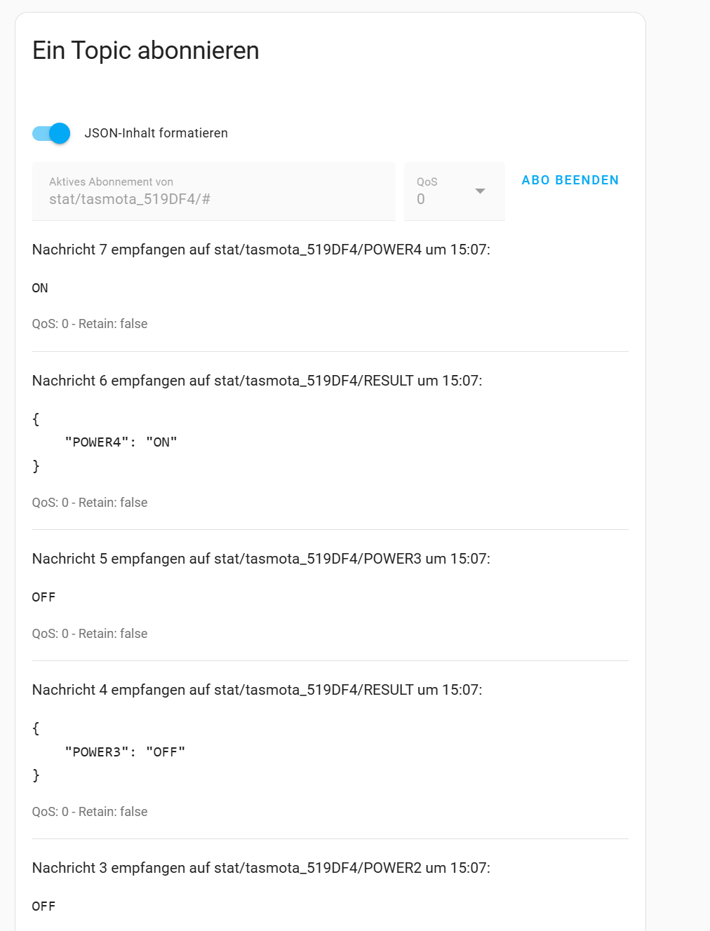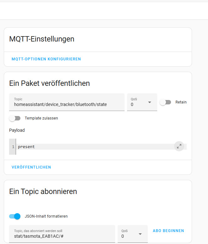 kommt es auch in HA an wenn du dort in der MQTT implementierung auf “Ein Topic abonieren” gehst? Kommen andere MQTT Messages in HA an und werden verarbeitet?