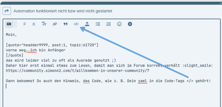 Dann bekommst Du auch den Hinweis, das Code, wie z. B. Dein yaml in die Code-Tags </> gehört!