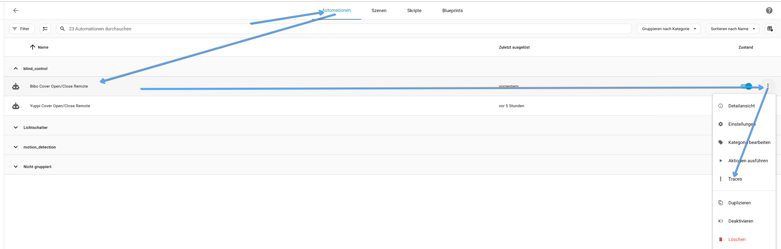 Dann gibt es in den Automationen das Trace, z. B.