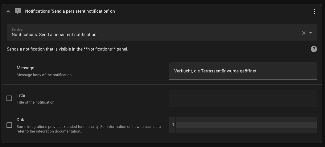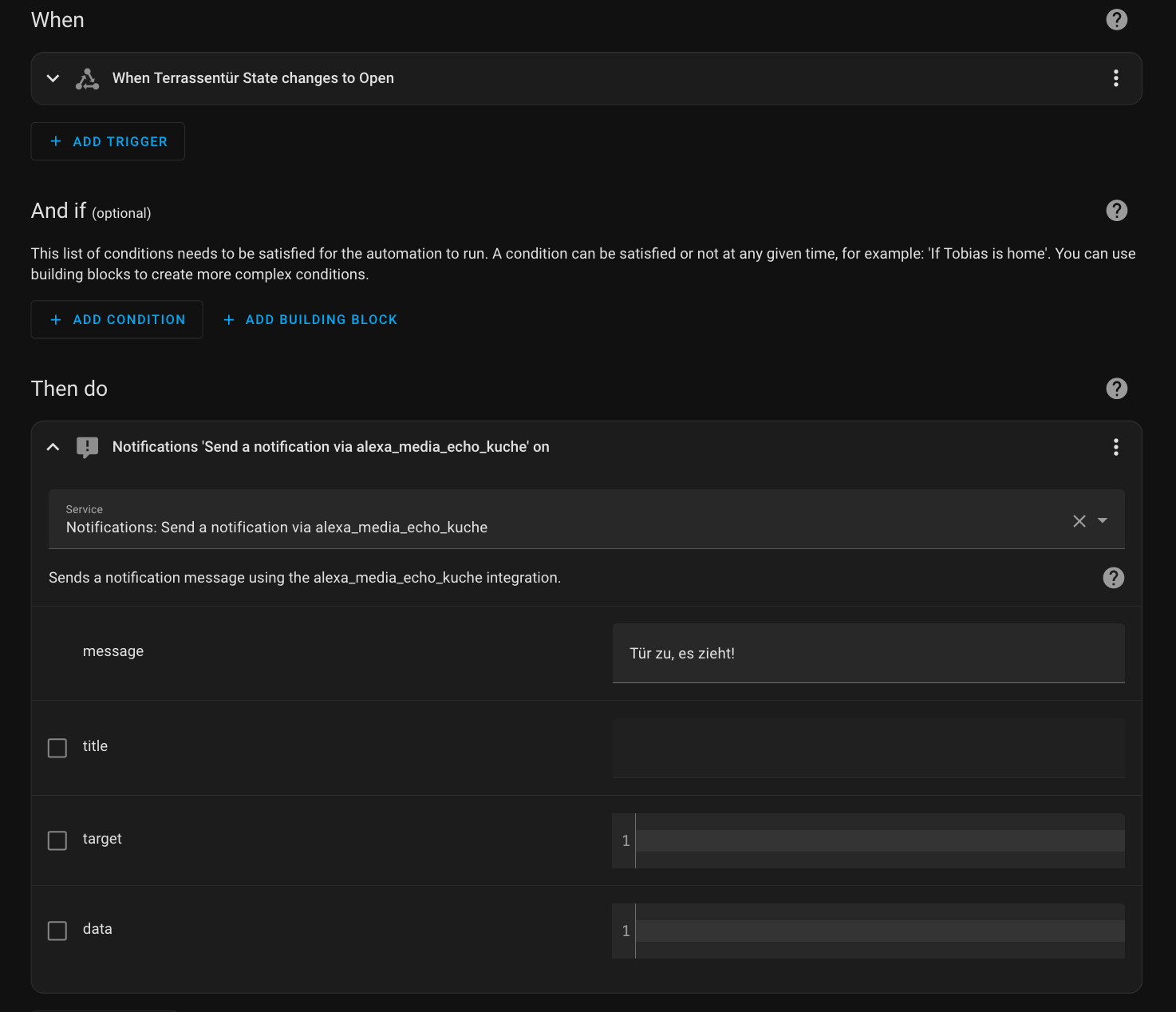 Wenn du dies als Code schreibst, musst du dich sehr genau an die in Yaml geltenden Regeln für Einrückungen halten (vgl. bei mir oben). Leichter ist es, wenn du den visuellen Editor nutzt. Dann achtet Home Assistant selbst darauf, dass der zugehörige Code korrekt ist.