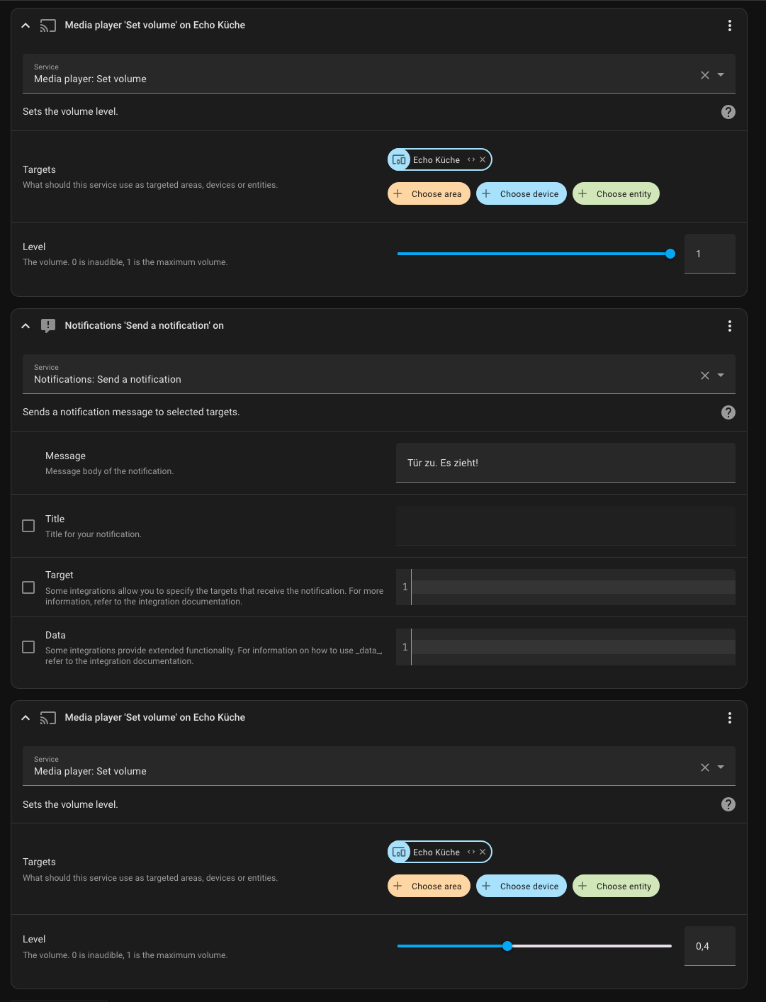 Hier ein Beispiel, wie die Lautstärke erst auf 100% geschaltet wird und dann nach der Benachrichtigung auf 40% springt: