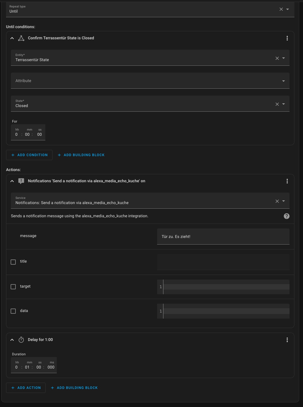 Zur zweiten Frage: Was meinst du mit “länger angezeigt”? Die Nachricht wird von Alexa ja nicht angezeigt, sondern gesprochen. Du kannst die Nachricht aber z.B. zusätzlich auch bis zum Wegklicken in Home Asistastnt anzeigen lassen:
