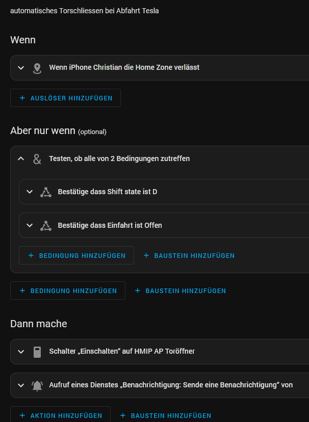 Leider ist der Tesla beim Übertragen seines Standortes an HA sehr träge, so dass ich als Zusatz noch das Handy von mir und das gemeinsame Verlassen der Zone dazugenommen habe.
