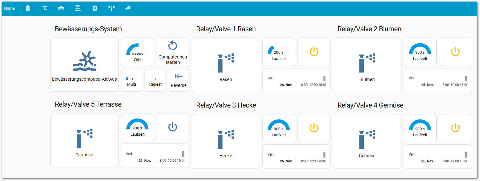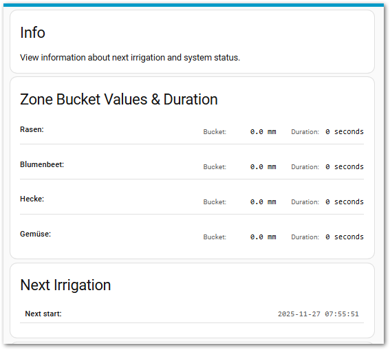 Die Smart Irrigation Integration ist soweit eigerichtet für 4 Zonen, zeigt aber dem Wetter geschuldet, denke ich, 0 als gerechnete Bewässerungsdauer.