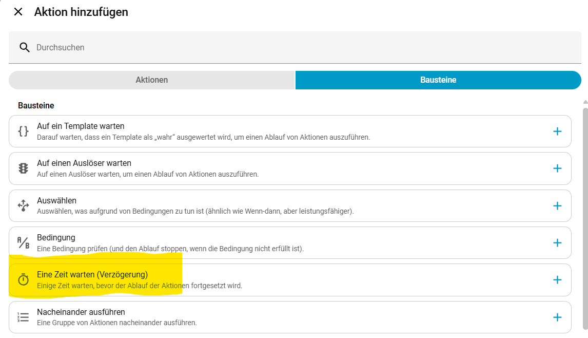 Oder du fügst statt dem Timer einfach “Warten” ein (5 min) und danach das Ausschalten. Wenn du den Modus wie von mir empfohlen setzt, wird die Autoamtion neu gestartet - auch wenn gerade noch eine Session läuft.