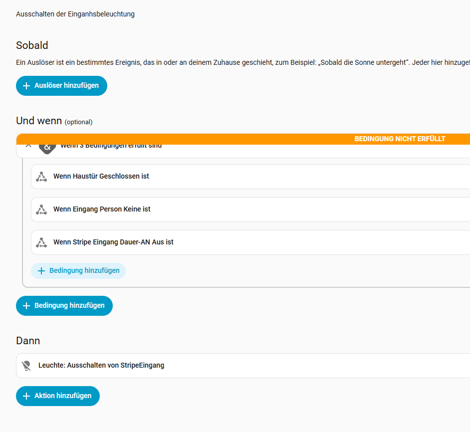 Das Ausschalten per Automation habe gemacht damit ich nicht in beiden Einschalten-Automationen jeweils gegeneinander prüfen muss (es kann ja sein, dass die Haustüre geschlossen wird, aber eine Person erkannt ist oder keine Person erkannt wurde aber die Haustüre offen ist).