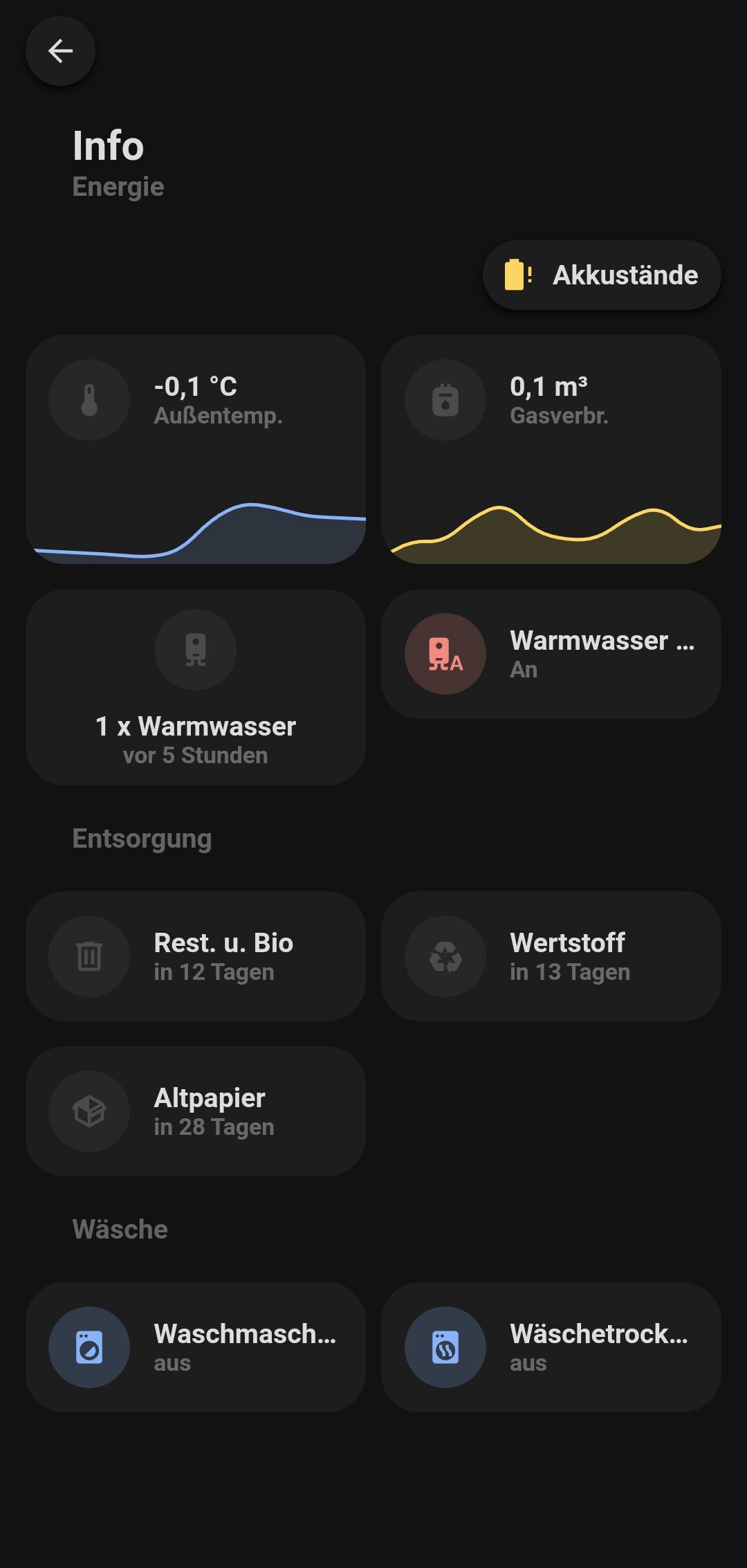 Bei mir werden dann die verbleibenden Tage bis zur Leerung angezeigt und einen Tag vorher anstatt die Zahl dann “morgen” bzw am selben Tag dann “heute” die Farbe des Icons ändert sich dann am Tag der Abholung entsprechend.