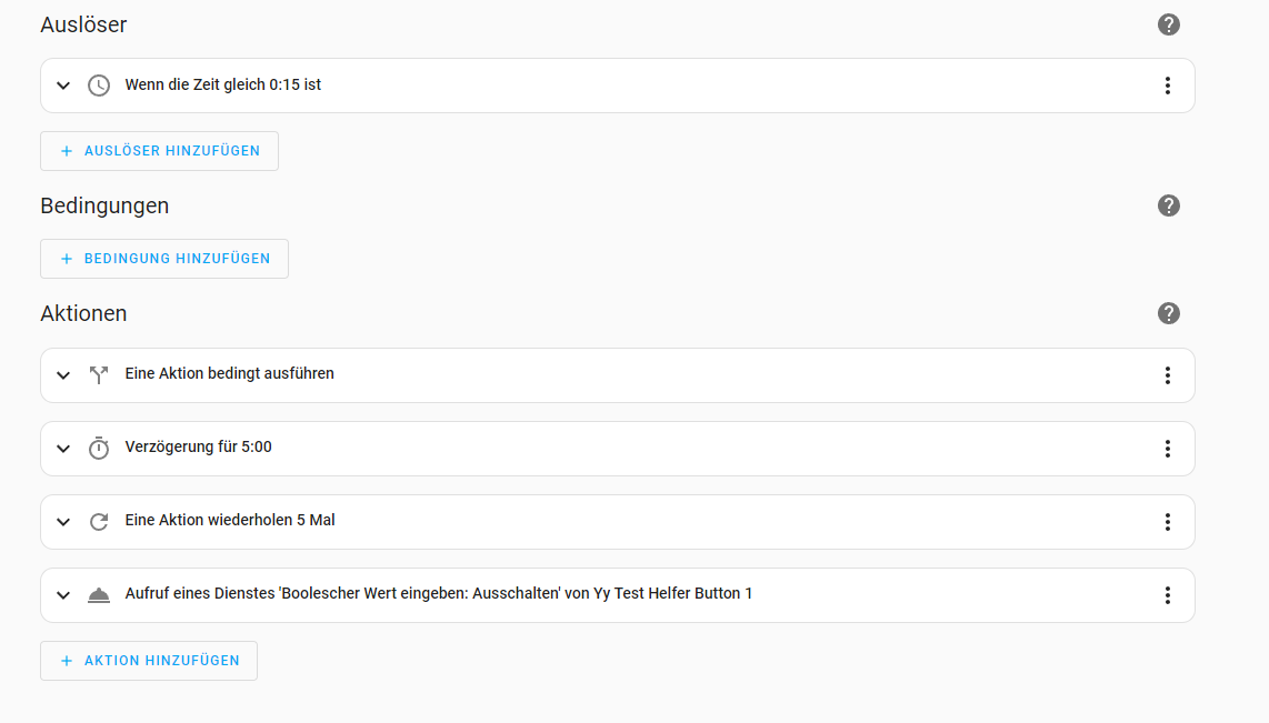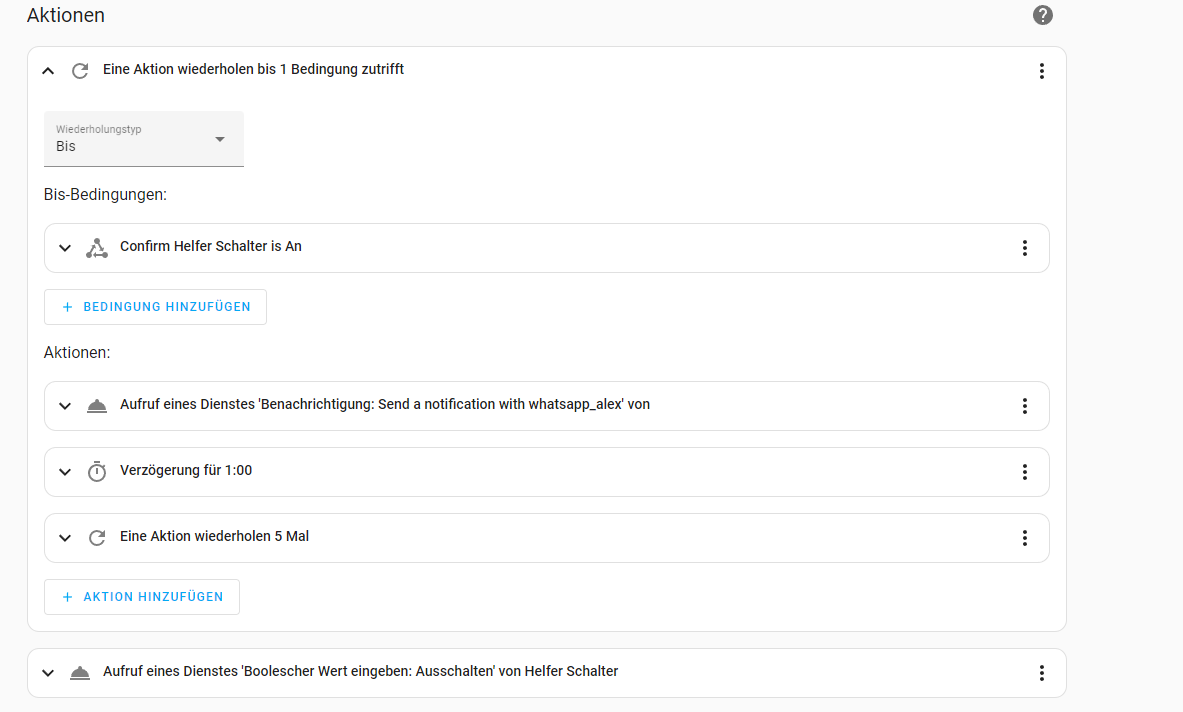 Hallo Zusammen, wenn bis zur einen bestimmten Zeit kein Schalter gedrückt wird wir eine whatsapp Meldung gesendet, jetzt wollte ich die Meldung jede 5min. wiederholen, bis der Schalter gedrückt wurde.