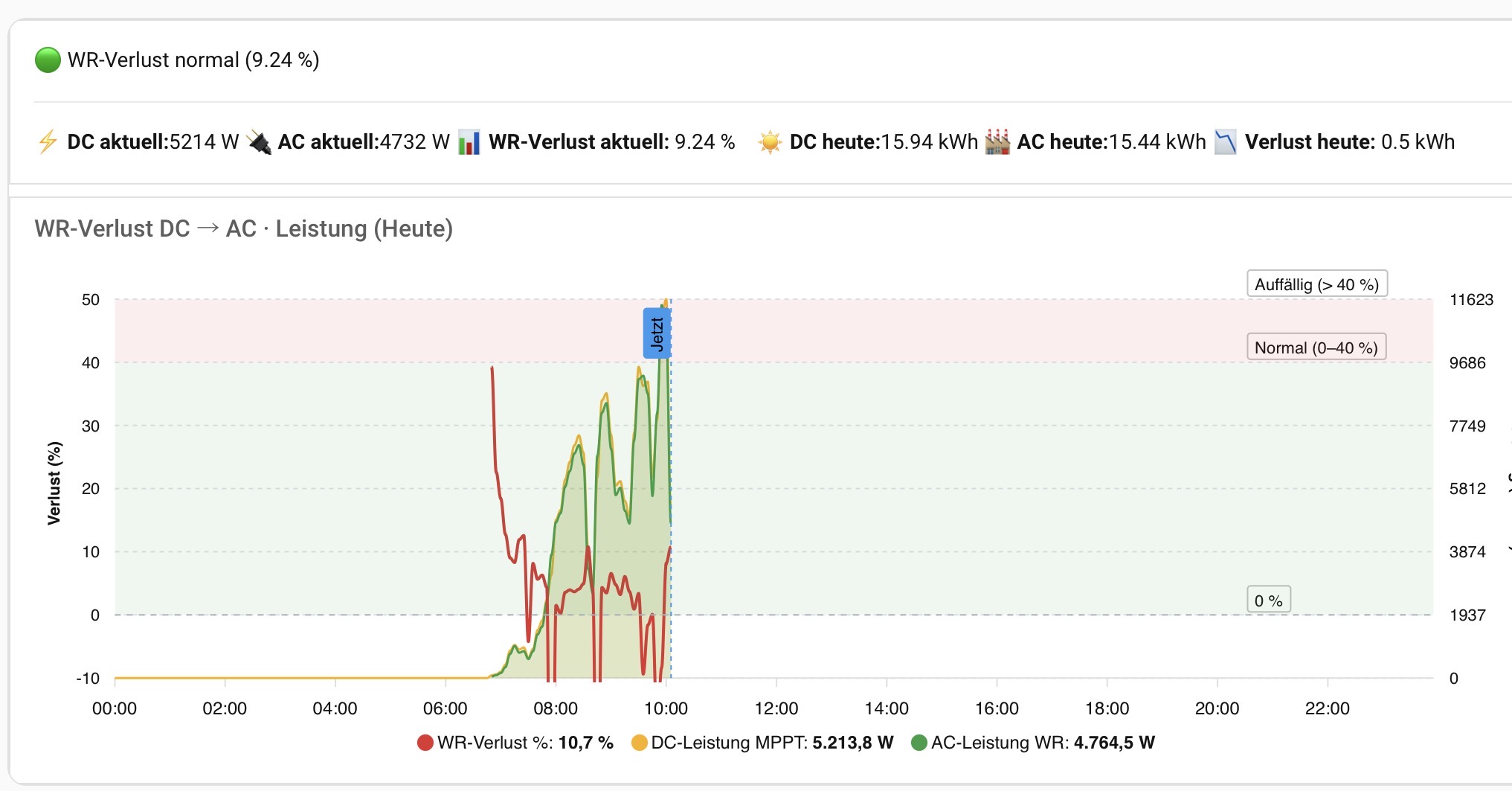 Ansonsten soll die Verlustleistung berechnet werden aus DC minus AC-Leistung solange DC > AC. Manchmal kommt es zu ungenauigkeiten und die AC Leistung ist kurzzeitig > der DC Leistung.