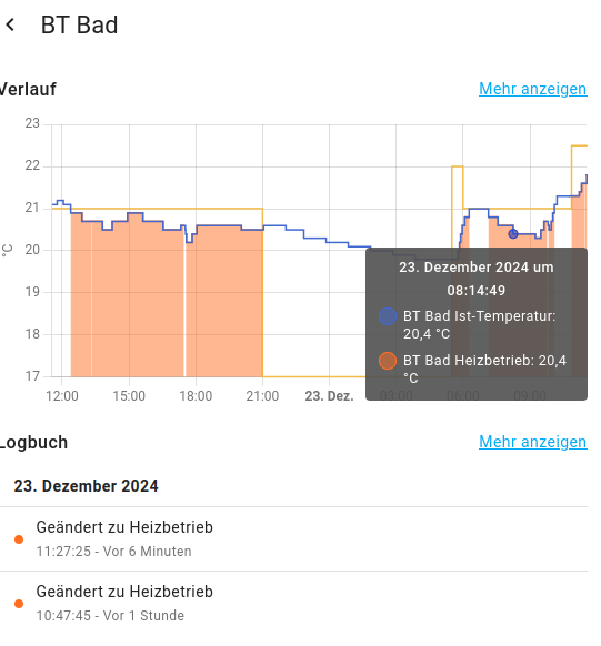 Im Scheduler sind die Soll Temperaturen wie folgt festgelegt Tagestemperatur 21 Grad, Nachtabsenkung 17 Grad. Beim Beginn des Heizzyklus für 30 Minuten 22 Grad. Das läuft meist auch sauber durch bis auf diese eigenwilligen Änderungen, die dann immer korrigiert werden müssen. Wobei die Abweichungen temperaturtechnisch immer nach oeb gehen und sich bis jetzt zwischen 0,5 und 7 Grad (MAX) bewegt haben.