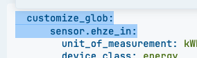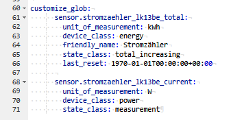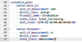 Customize fügt zu bestehenden Sensoren Modifikationen hinzu, in diesem Fall z.B. zum Sensor.stromzaehler_lk13Be_total die Einheit kWh und Device und stateclass