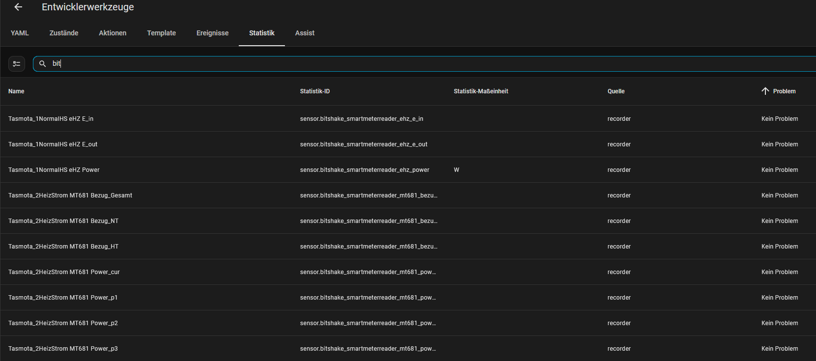 template: - sensor:sensor.bitshake_smartmeterreader_ehz_power ← So heißt dieser Sensor - name: "Stromzähler Gesamtverbrauch Korrigiert" unit_of_measurement: "kWh" device_class: "energy" state_class: "total_increasing" state: >- {{ states('sensor.bitshake_smr_total_in') | float(0) }}