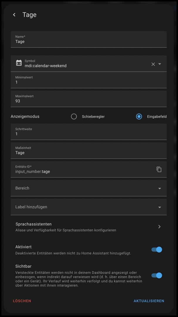 Ich habe noch einen Schieber eingefügt, um die Anzahl der zu zeigenden Tage wählbar zu machen… Wie man das mit graph_span: ${states["input_number.tage"].state +'d'} hinbekommt, hat ein netter Mensch hier aus dem Forum mir vor einiger Zeit gezeigt. Wie klasse ist denn das bitte!