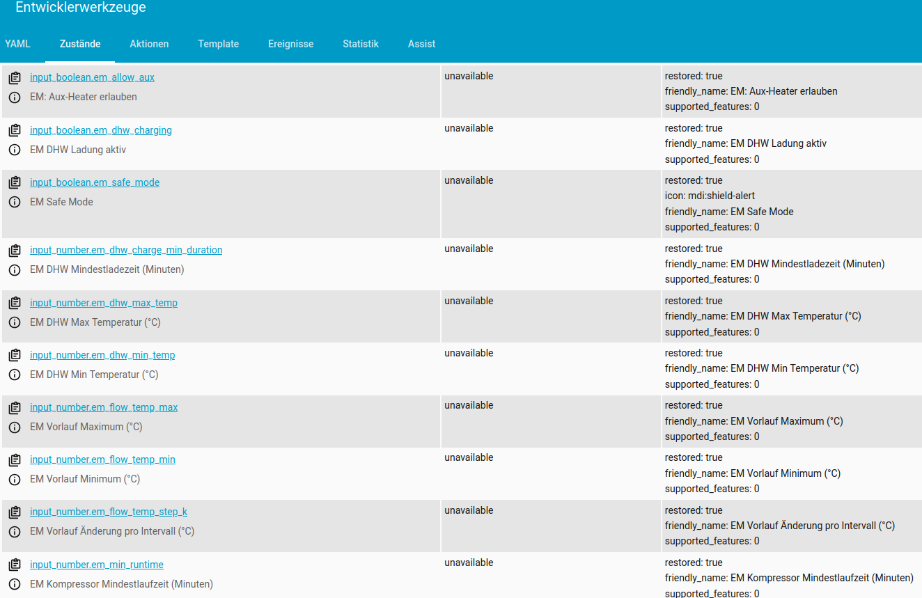 Zusätzlich habe ich ein rudimentäres Dashboard mit allen relevanten Entitäten zur Steuerung der Wärmepumpe erstellt (rein zur Übersicht und prüfen der Daten die alles steuern):