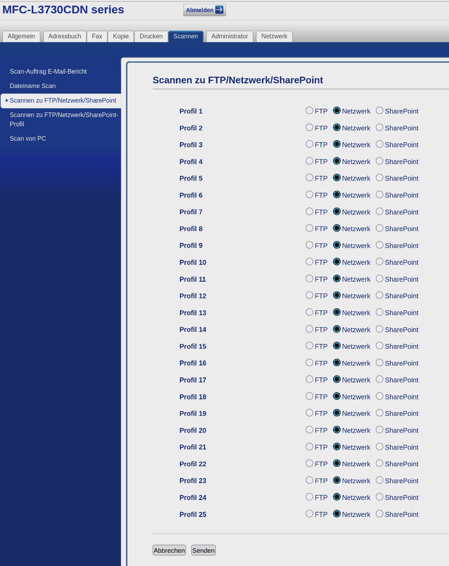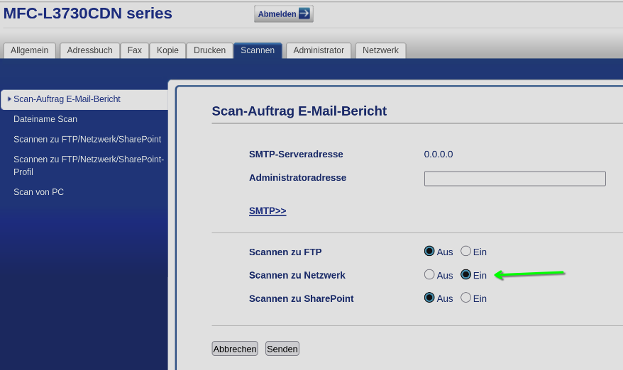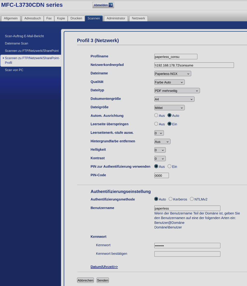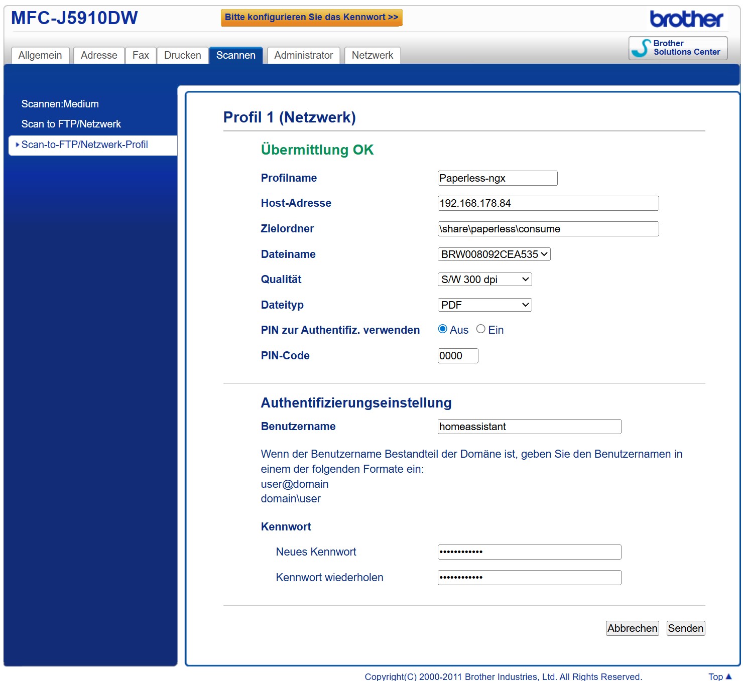 Was mich allerdings ein wenig stutzig macht, ist die Tatsache das man bei Passwort “Neues Passwort” stehen hat und dieses auch wiederholen muss im Brother Web Interface.
