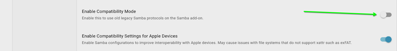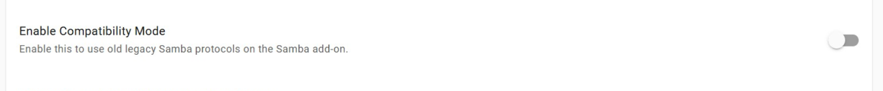 Setting this option to true will enable old legacy Samba protocols on the Samba add-on. This might solve issues with some clients that cannot handle the newer protocols, however, it lowers security. Only use this when you absolutely need it and understand the possible consequences.