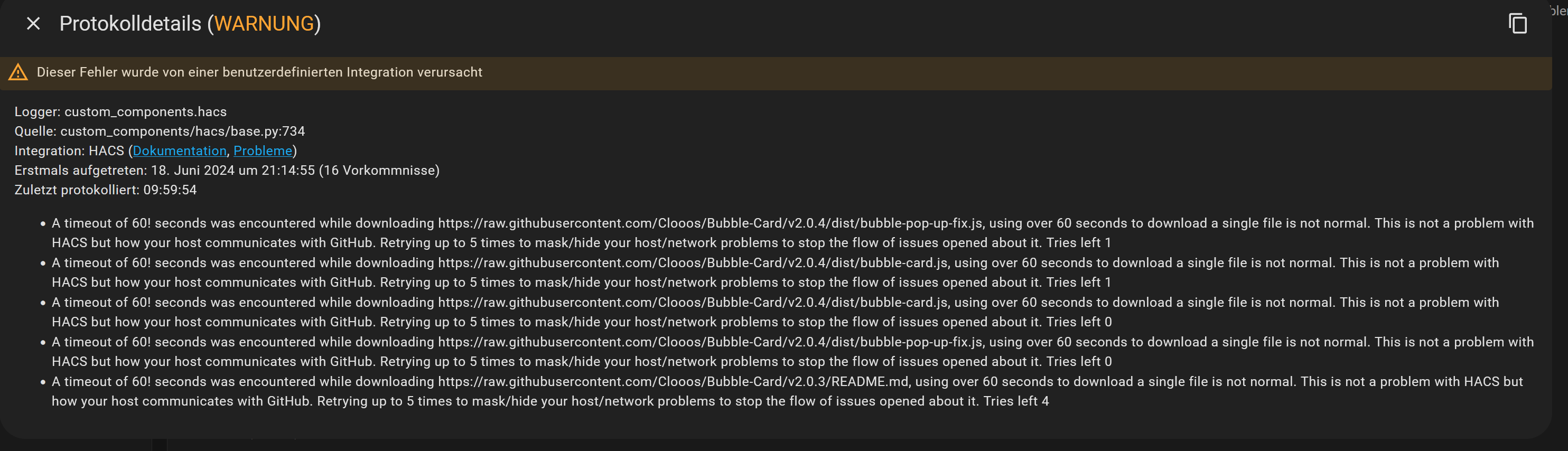 Moin, auf meinem HA System versucht HA nun schon seit ein paar Tagen ein Update von Bubble Card (von 2.0.3 auf 2.0.4) zu installieren. Das klappt aber nicht. HA schon mal neu gestartet, hilft auch nichts. Das Update bleibt immer bei ca. 30% hängen, und dann passiert nix mehr. Ist das so ein Problem? Wie finde ich raus, warum das nicht klappt?