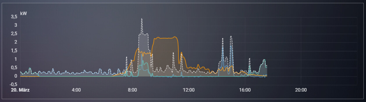 Die gestrichelte Linie wird als Verbrauch bezeichnet. Diese Bezeichnung ist aus meiner Sicht irreführend, da sie den Momentan-Verbrauch des Haushaltes impliziert. Die gestrichelte Linie “Verbrauch” ist dabei die Summe aus Solar und Netz.