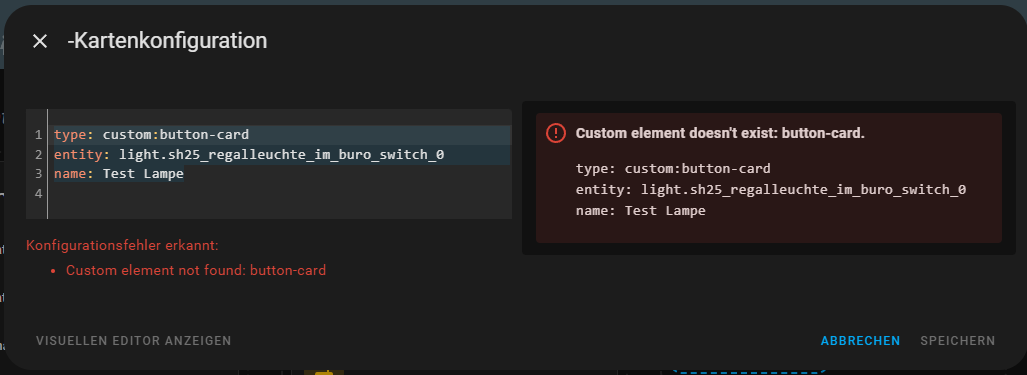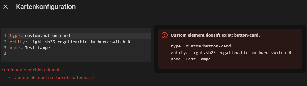 ABER: bei mir wird button-card (custom:button-card) nicht gefunden, obwohl installiert und neu gestartet wurde.