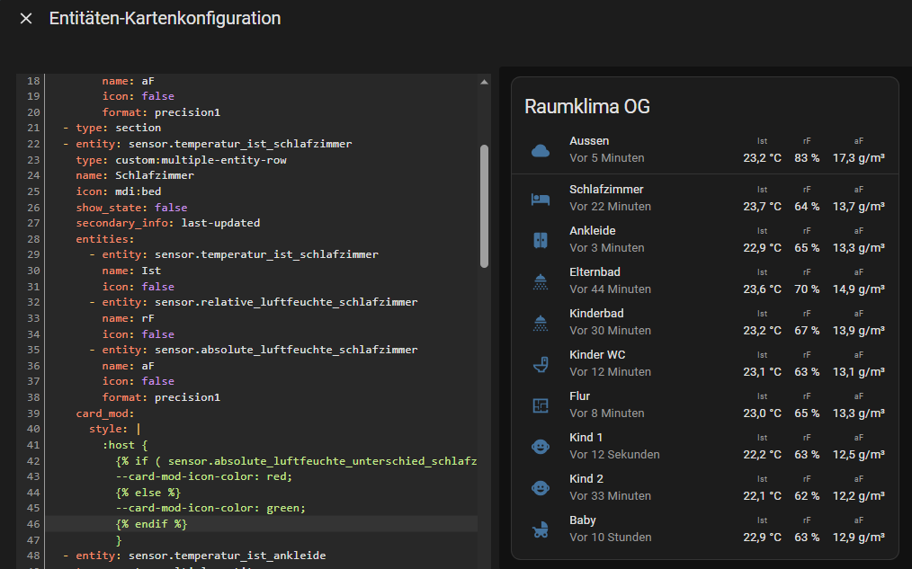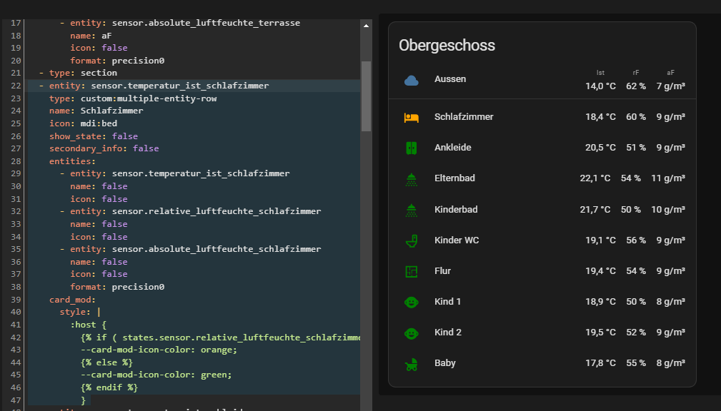 Konkret - ich habe aktuell folgende Karte mit folgendem Code. Bei dieser Karte färbe sich das Icon abhängig des Sensors “orange” oder “grün”. Ich möchte nun zusätzliche wenn die absolute Feuchte im Raum größer ist wie Außen den Wert der absoluten Feuchte färben. Im folgenden Beispiel sollte die 9 g/m³ im Schlafzimmer orange dargestellt werden - Ideen?