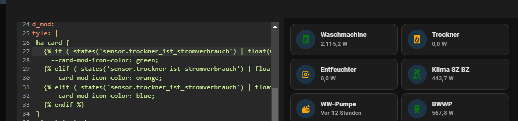 Danke für den Hinweis. Aber ja - ich würde gerne die vorhandene Karte nutzen und nur das Icon unter genannten Bedingungen färben. Ich vermute mal das ganze wird mit der card-mod schon funktionieren … allerdings übersteigt das meine Fähigkeiten