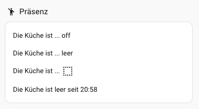 Die Küche ist ... {{ 'leer' if is_state('binary_sensor.sonoff_snzb_06p_kue_occupancy', 'off') else 'nicht leer' }}