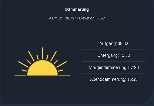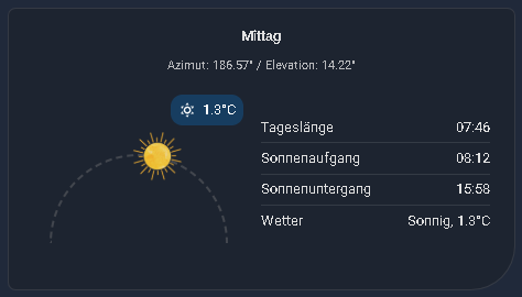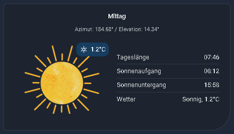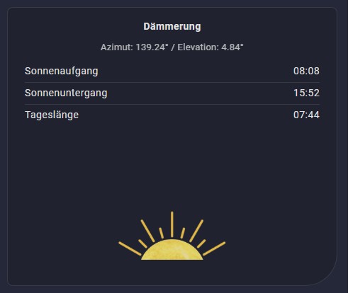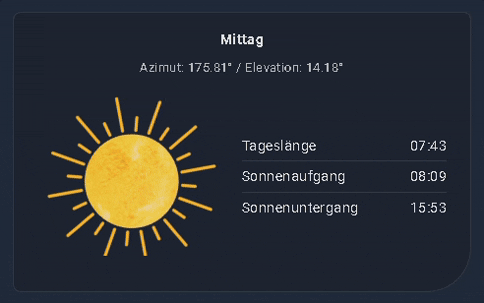 Dies ist eine benutzerdefinierte Lovelace-Karte zur Visualisierung der aktuellen Sonnenposition mit entsprechenden Sonnenstandbildern und zur Anzeige relevanter Sonnenzeiten inklusive berechneter Tageszeitlänge. Die Karte ist vollständig über die Benutzeroberfläche des Karteneditors konfigurierbar.