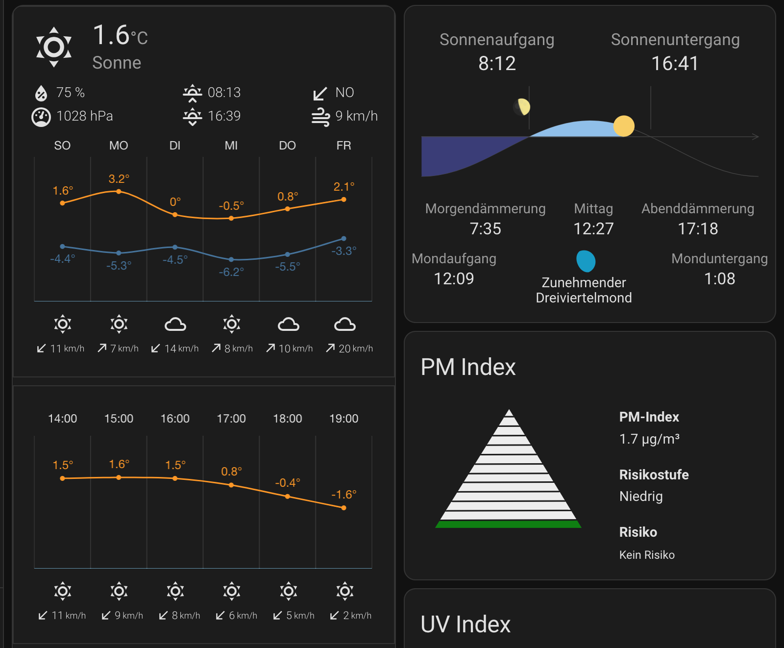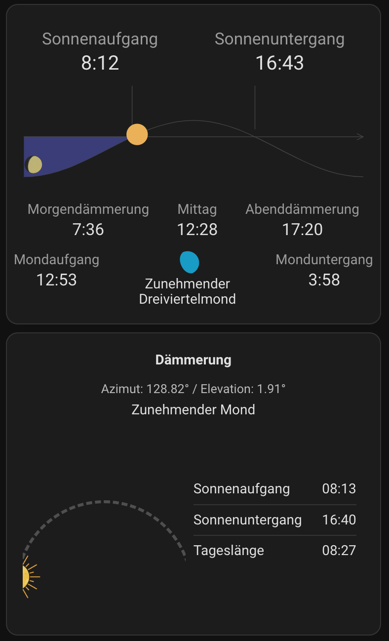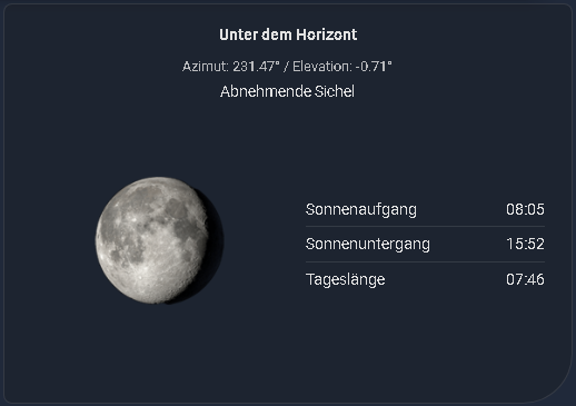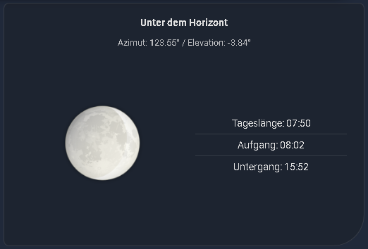 Hi, ich bin endlich soweit, meine erste custom Card steht im ersten Release zur Verfügung und ich freue mich über Feedback von euch. Aktuell bin ich dabei auch noch die Mondphasen zu integrieren, erstmal als Textvariante, später auch über die Bildanzeige.