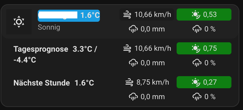 Hi, euer eigener Temperatur-Sensor sollte jetzt mit der v_1.5.1 hinterlegt werden können. Ich habe es so gestaltet: der Wetter-Sensor muss weiterhin eingetragen sein, im Anschluss erscheint ein neues Input Feld und ihr könnt dort euren Temperatur Sensor eintragen. Dieser Sensor überschreibt dann die Temperatur aus dem Wetter-Sensor. So hat man trotzdem immer schön den aktuellen Wetter Status (Sonne, bewölkt usw.) mit integriert. Ich denke das passt so am besten und ist dann auch besser für die Weiterentwicklung nutzbar.