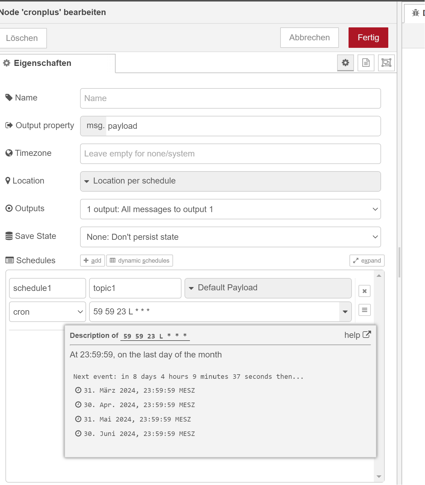 Die node kann man über den Paletten-Manager installieren, wenn man den Namen der Node eingibt - eine Beschreibung findet man hier: node-red-contrib-cron-plus (node) - Node-RED