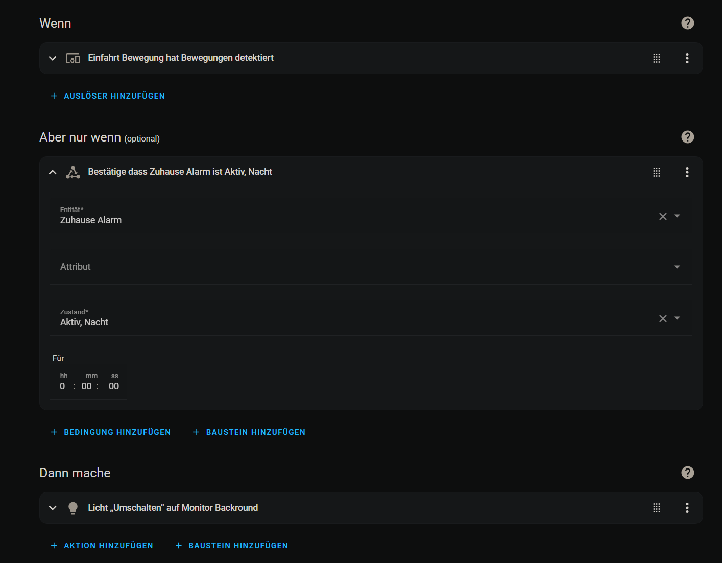 Wie der Titel schon sagt, ich habe 4 Sensoren in eine Binärsensor Helfer Gruppe gepackt die dann die Sensoren der Alarmanlage sind. Wie bewerkstellige ich es, dass die Sensoren also quasi die Automation nur dann auslöst, -wenn- die Alarmanlage scharf bzw. im Nacht / Abwesenheitsmodus ist? ( Automation ->“wenn” dort sollte dies als Bedingung rein). Evtl. total simple, nur ich bekomms nicht hin. Dankeschön für eure Hilfe schonmal vorab.