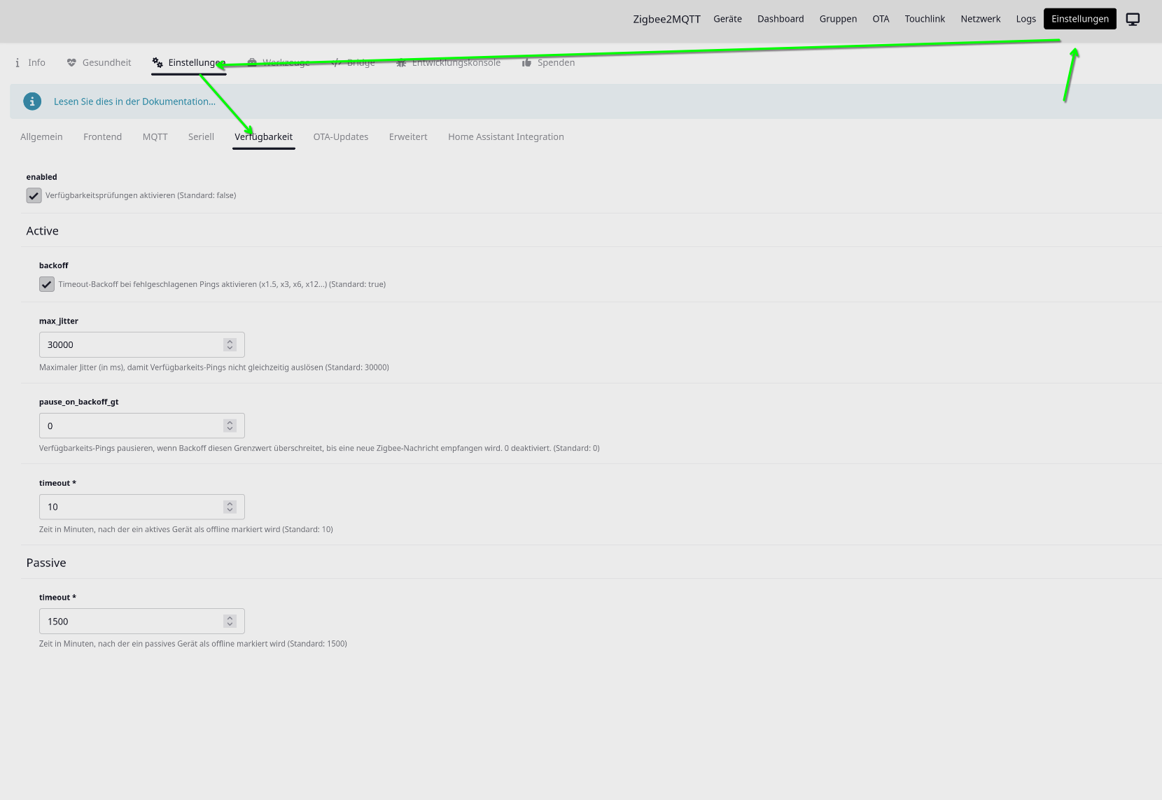 Als nächstes über die GUI und den Punkt Verfügbarkeit die passiven Geräte aktiviert und die Steckergeräte auf timeout 30 gestellt.