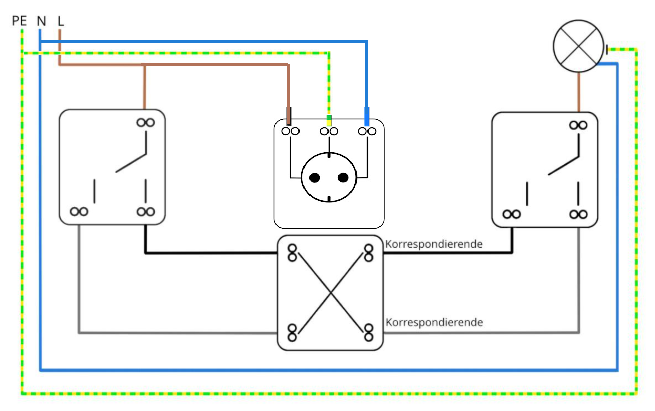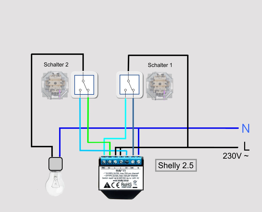 Die Schaltung ist jetzt wieder eine “normale” Kreuzschaltung mit einem Shelly 2 dazwischen, wie @Osorkon es vorgeschlagen hat.