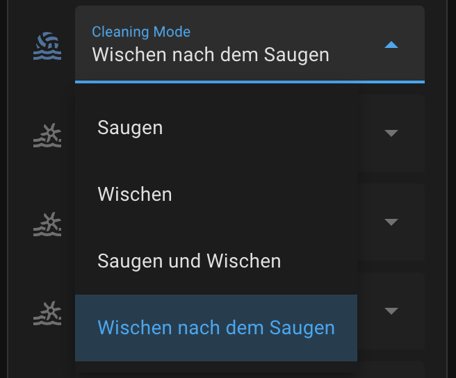 Genau das ist der Knackpunkt: Mit den Dienstaufrufen in der Automation gibts zwar eine Auswahl der Saugstufe und der Wasserintensität - letztere aber nur in 3 Stufen, statt der Numerischen Auswahl (1-32) - und den Saugmodus (Select) kann ich gar nicht auswählen.