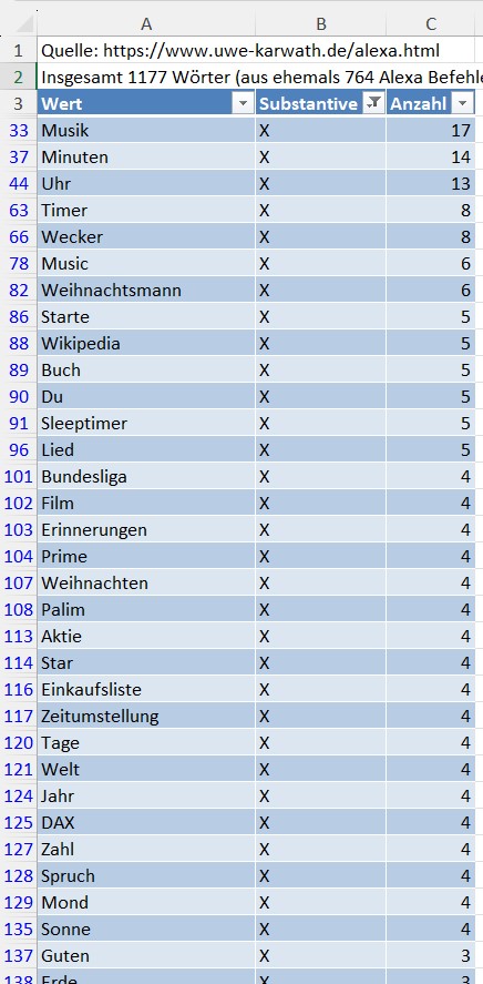 Mir ist keine Liste bekannt aber viele Freiwillige haben Listen von Alexa-Sätzen erstellt, z.B. https://www.uwe-karwath.de/alexa.html#Allgemeinbildung Du könntest jetzt die Statements von dieser und anderer Seiten in eine Textliste speichern und diese nach ChatGPT kopieren und sagen “bitte sage für jedes Word wie oft es vorkommt”, “gib das Ergebnis als Excel aus”.