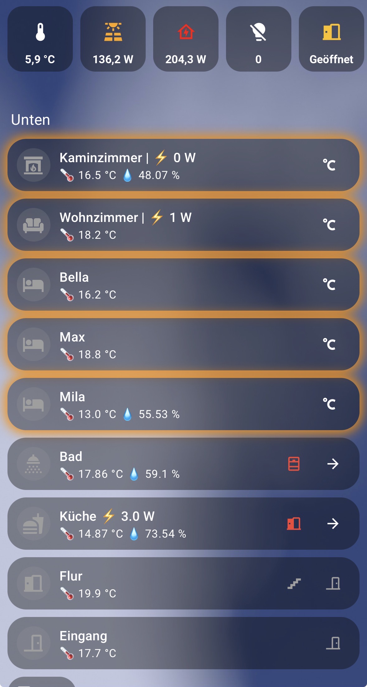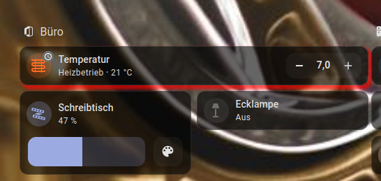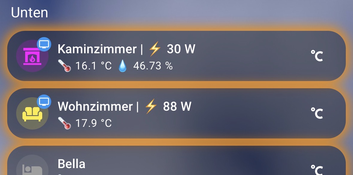 Für meine Frau war sehr wichtig so wenig wie möglich zu klicken. Nicht erst den Raum öffnen oder so. Ebenfalls zu sehen, ob ein Thermostat gerade inaktiv oder auf heizen steht, darum gibt es um jeden Raum einen schimmernden roten Rahmen, wenn gerade geheizt wird. Ebenso, dass ein Klick eine Lampe sofort ein/ausschaltet und nicht erst das Menü für Farbe, Helligkeit etc. angezeigt wird: Auf Raumicon tippen.