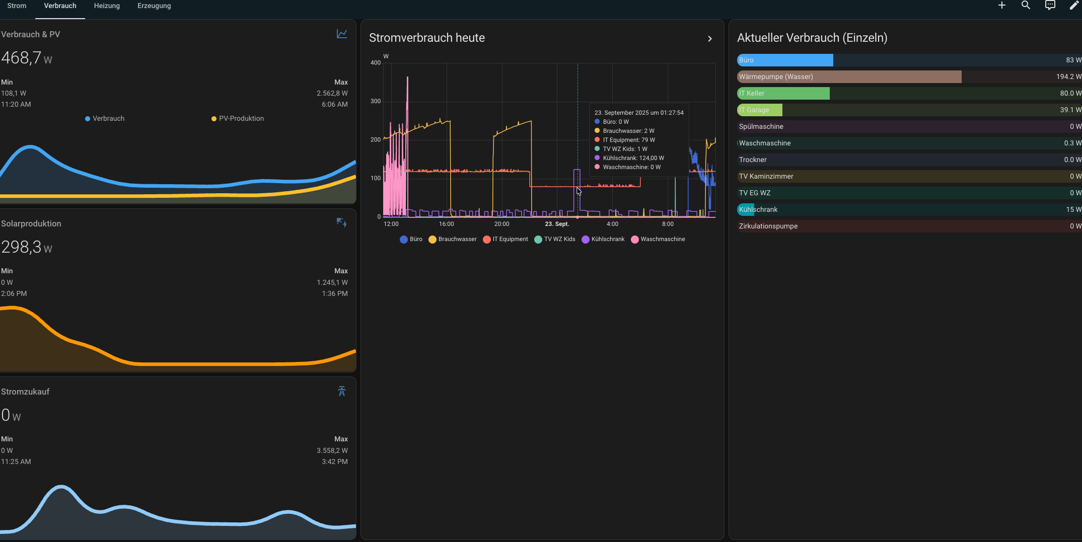 Hier ein paar Screenshots dazu, wie das bei uns aussieht. Jedes Element ist “antippbar” und schaltet um wie z.B. die Treppe das Licht, Stehlampe etc. bzw. öffnet die Eigenschaften oder eine Historie bei z.B. Energieverlauf