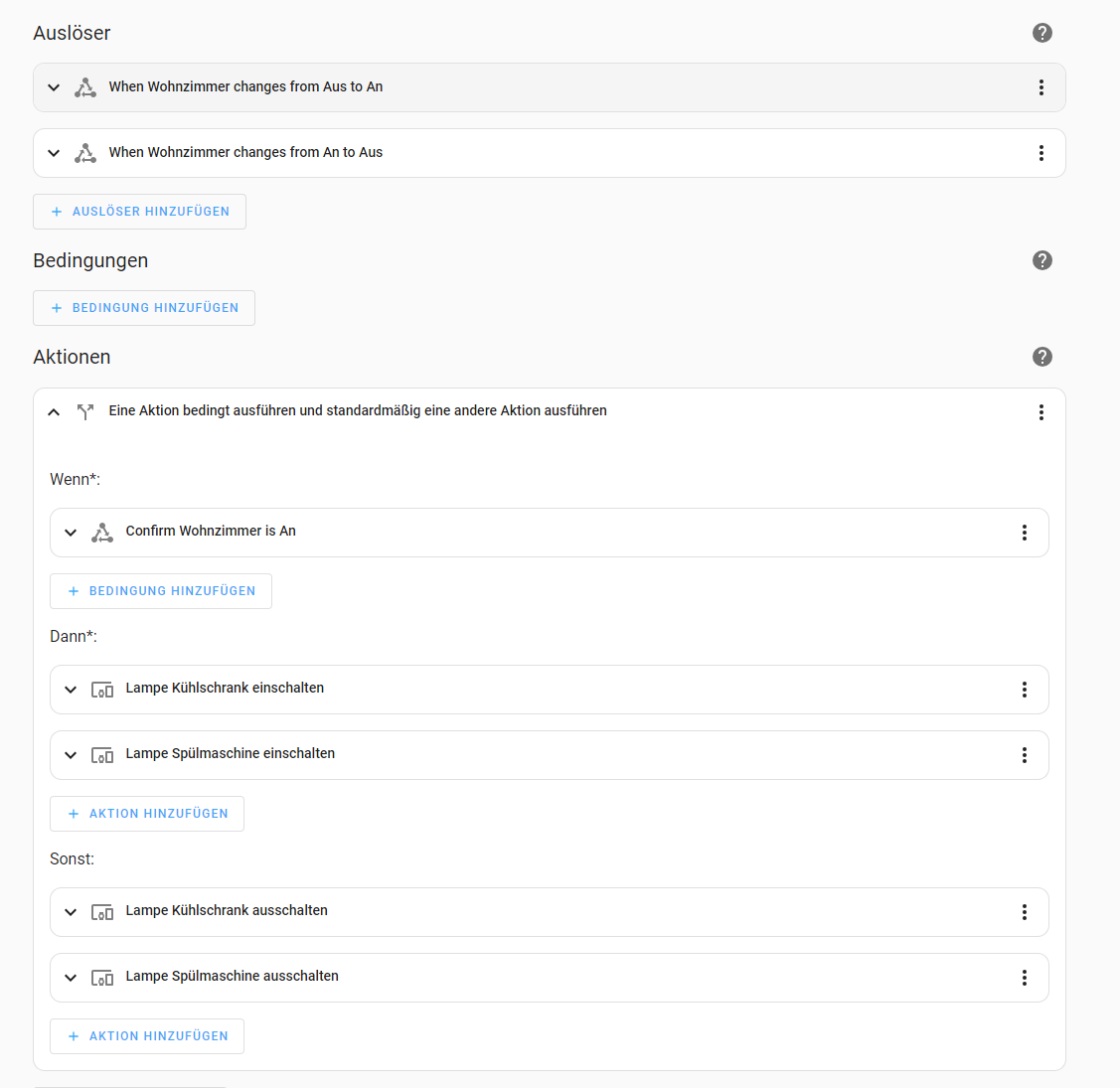 Ist mein Vorgehen grundsätzlich falsch? Ich frage mich auch wie ich bei den Lampen noch die genaue Helligkeit vorgeben kann. Die Helligkeit kann ich aber nur vorgeben, wenn ich als Aktion “einschalten” auswähle. Müsste ich dann in der Automatisierung noch vorher prüfen ob die Lampen ausgeschaltet sind, sodass nur eingeschaltet wird wenn sie vorher aus waren und umgekehrt?