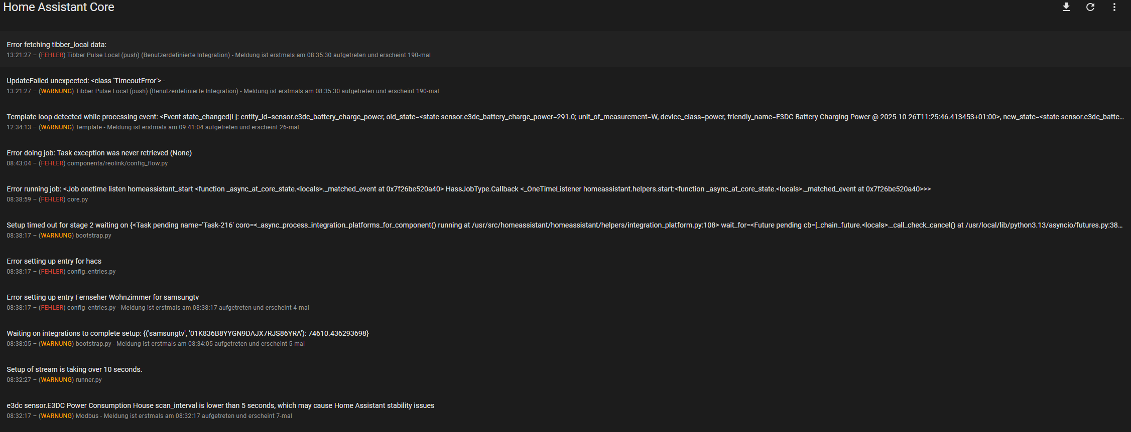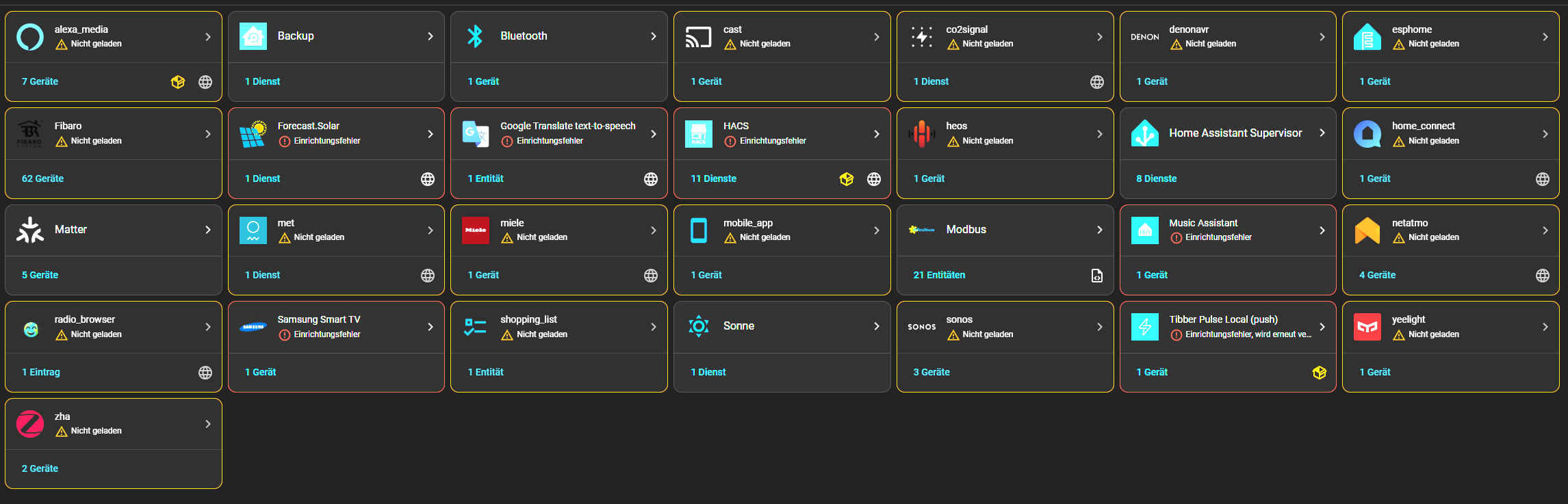 Ich komme aber mit einem großen Problem nicht weiter. Diverse (fast alle) Integrationen verlangen ja nach einem Neustart nach der Installation. Nach jedem Neustart laden aber meine bisherigen Integrationen nicht mehr richtig, entweder es ist ein “Einrichtungsfehler” oder es kommt die Meldung “nicht geladen”. Es gleicht fast einem Glückspiel ob ich diese Integrationen mit dem Button “neu laden” wieder an den Start kriege oder nicht. Oftmals fehlt dieser Befehl “neu laden”.